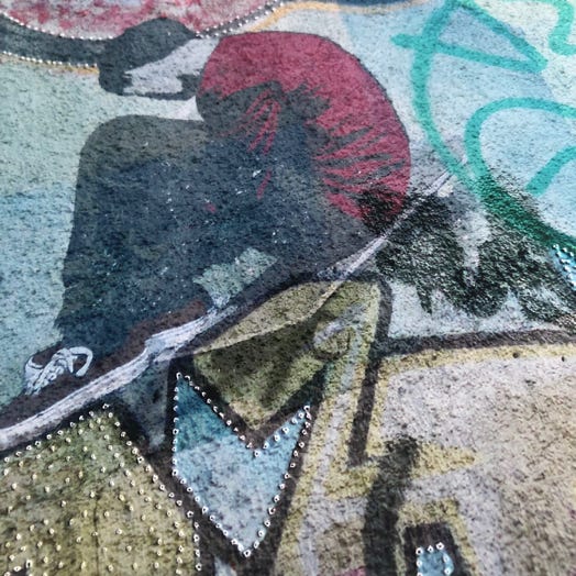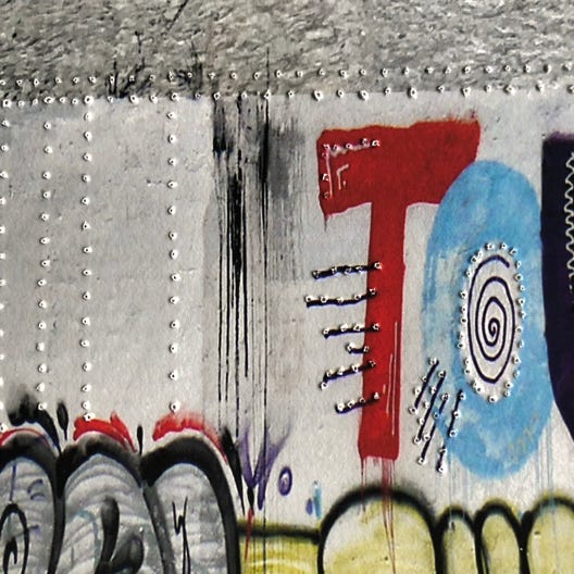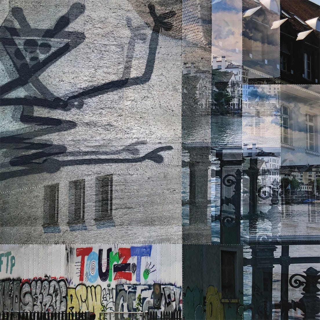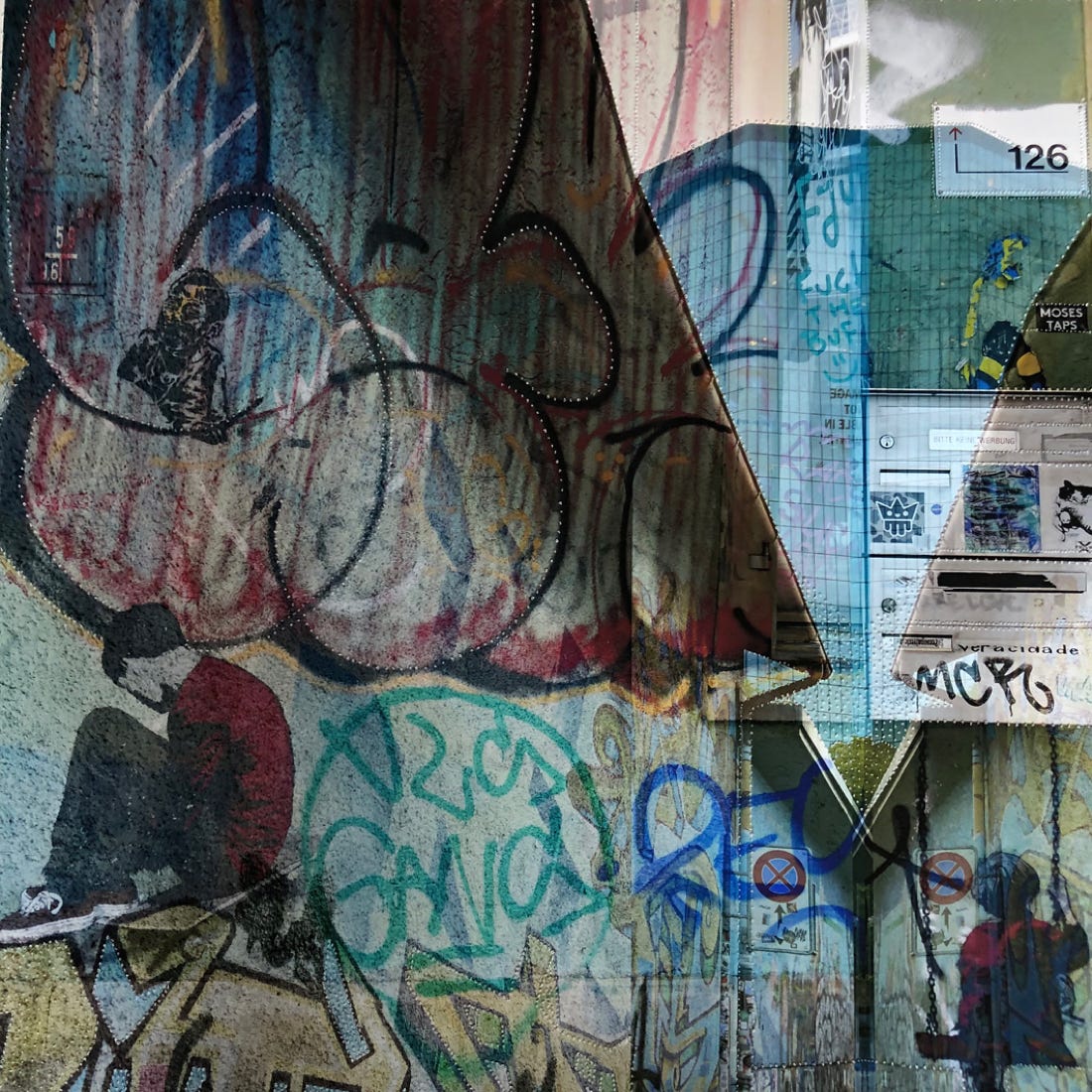 Graffiti an den Wänden einer Stadt sind wie Tätowierungen auf unserer Haut. Als bildhaft gemachte Assoziation entstehen so aus mehreren Graffitifotos digitale Fotocollagen, die durch das Aneinanderreihen, Überblenden und Verschmelzen verdichtet werden und zum eigenen Entdecken einladen. Auf Hahnemühle Fine Art Photo Rag Papier im Giclée Verfahren gedruckt werden sie zum Schluss von Hand mit Nadeln gestochen und perforiert und erinnern so an Schmerz und Verletzungen, denen wir alle ausgesetzt sind.